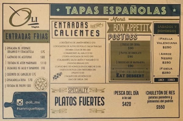 Oli Tapas is in the interior of Doce 18, located at Calle de Relox 18 in San Miguel de Allende, Mexico. The restaurant is open Monday to Thursday, 1:00 to 9:00 pm; Friday and Saturday, 1:00 to 11:00 pm; and Sunday 1:00 to 7:00 pm.