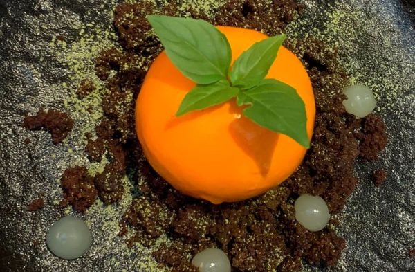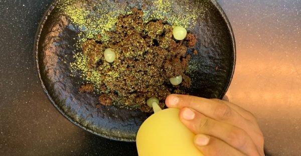 Forming the base on the dusted green plate was a crumbled brownie and, in the center of it, a truffle-like, gooey chocolate cream. Next, came daubs of citrus jelly that were reminiscent of the filling in a lemon meringue pie.