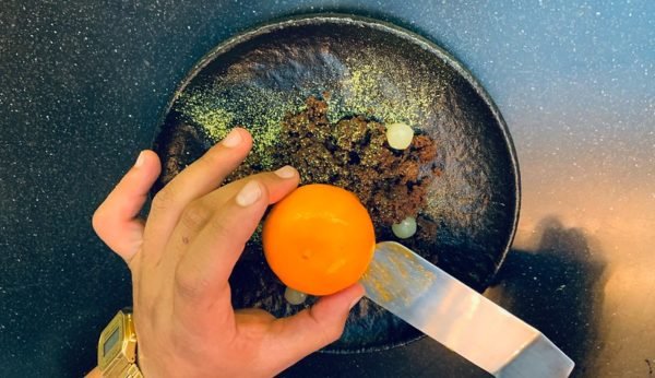 Finally, a mandarin-sized and colored ball was feathered into position and topped with a sprig of spearmint. Don Day’s Wife was humming Carly Simon’s Anticipation as we broke open the orange crust. I was so happy that inside was not some exotic filling but traditional, New York style cheesecake.