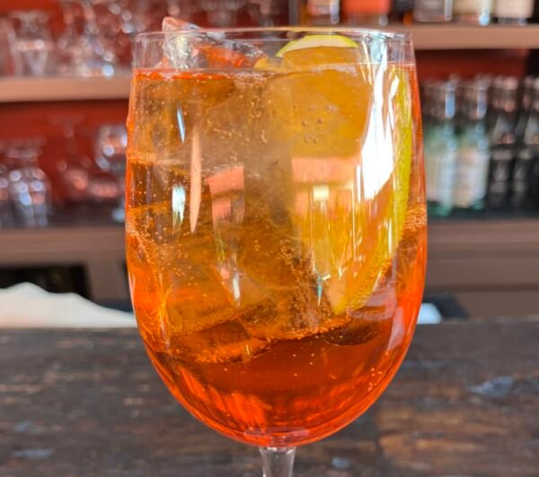 Don Day’s Wife likes her sunset in a glass. She orders an Aperol Spritz. I order a Victoria. The irresistible peanuts arrive in their just enough/not too many rationing jar.
