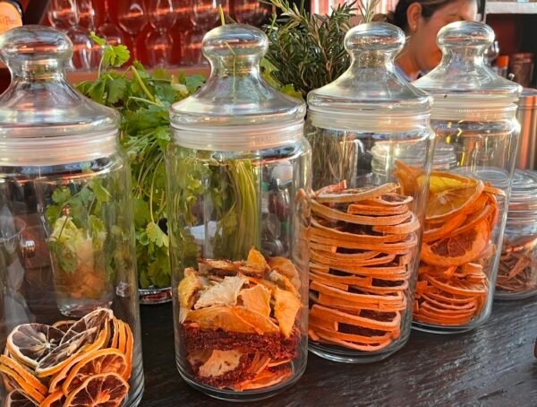 We gaze at the shelves, checking out how the classic labels…the Smirnoff’s, the Beefeater, the Captain Morgan, the Black & White…are being invaded by up-and-comers. We play guess the dried fruit in the row of jars.