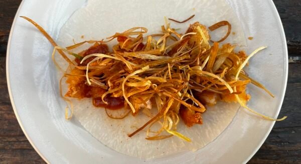 A thin slice of jicama is guillotined to replace the tortilla wrap on a traditional taco. It’s then layered with battered shrimp in a tamarind sauce and topped with crispy leeks.