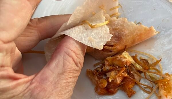 I bet Don Day’s Wife that I can get the taco into my mouth without wearing it. I lose. The jicama is imaginative but not practical.
