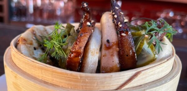 It arrives in what the Chinese call a zhēnglóng and we call a bamboo steamer. The dish is what the Vietnamese and we call bao.