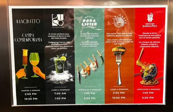 Confused yet? If not, you probably will be when you board the elevator. On its wall, in addition to La Baja, you’ll see plugs for four other attractions on Amatte’s roof. Last Saturday, we were there for the one on the right, the one called Canton Birriamen.