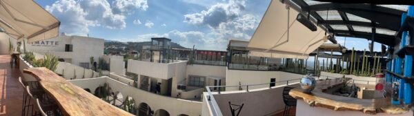 The roof started with and still is divided into what the hospitality biz calls “stations” with six or seven different areas for eating and drinking. Overall it’s called Amatte Wellness Community Club. The main area used to be called Hacmans and the menu was modelled after Deckman’s in Valle De Guadalupe with chef Drew Deckman acting as the restaurant’s “advisor”. The focus was on sustainable farming and cooking almost everything over a wood fire. The connection to Deckman’s then seemed to have been dropped and the words Cocina a la Neña (neña is firewood in Spanish) were used. These days, the word Hacmans appears to be also gone and the main menu goes under the name La Baha. The emphasis on open fire cooking though still remains.