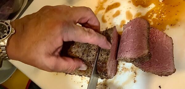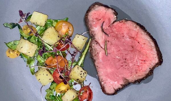 Next, we went from pork to beef. It was time for me to take another break. The main course was being served. It was a New York striploin. It’s a bold choice for a chef. People don’t get much pickier than they do over steak. One wants medium rare, another wants medium well, and one’s medium rare is another’s medium well. Plus there’s the complication of cost for the chef. He can pay $100 for a NY strip. He can pay $1000. Obviously, when you’re serving an entire multi-course dinner for $900, you have to source something that’s near the bottom of that price level. To serve something at that price level with an acceptable texture, taste and tenderness is a task.